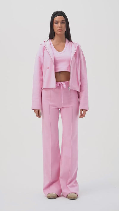 Kadın Pembe s6-98 Örme Kumaş Flare Eşofman Büstiyer ve Fermuarlı Sweatshirt 3'lü Kombin Takım