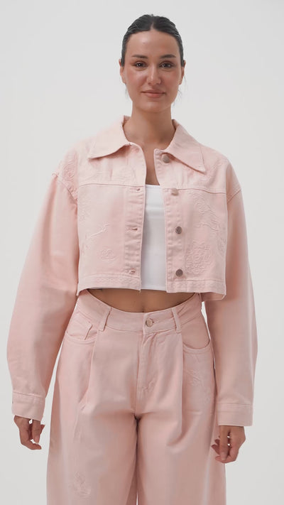 Kadın Pudra Renk 6s6-20 Crop Fit Çiçek Nakış Desenli Özel Tasarım Denim Ceket