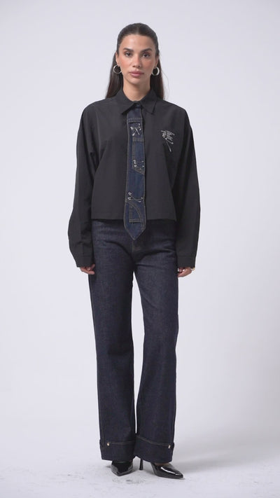 Kadın Siyah Renk Bol Kesim Kravat Detaylı Özel Tasarım Gömlek