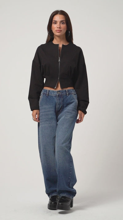 Kadın Siyah Renk w5-1 Bol Kesim Örme Esnek Kumaş Oversize Fermuarlı Sweatshirt