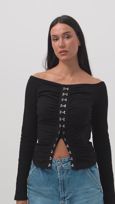 Kadın Siyah w5 Agraf Detaylı Omzu Açık Özel Tasarım Crop Top