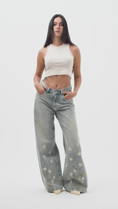 Kadın T.Kot Rengi 4s6-67 Palazzo Fit Özel Çiçek Nakışlı Tasarım Denim Jean