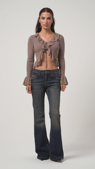 Kadın Taş Kahve Renk w5-82 BT25 Triko Örme Kumaş Şifon Detaylı Volanlı Hırka Bluz