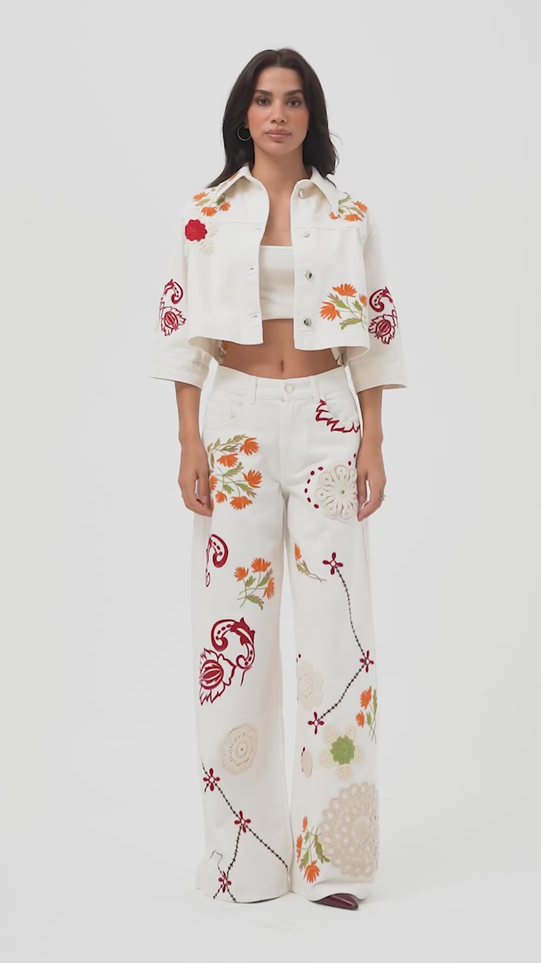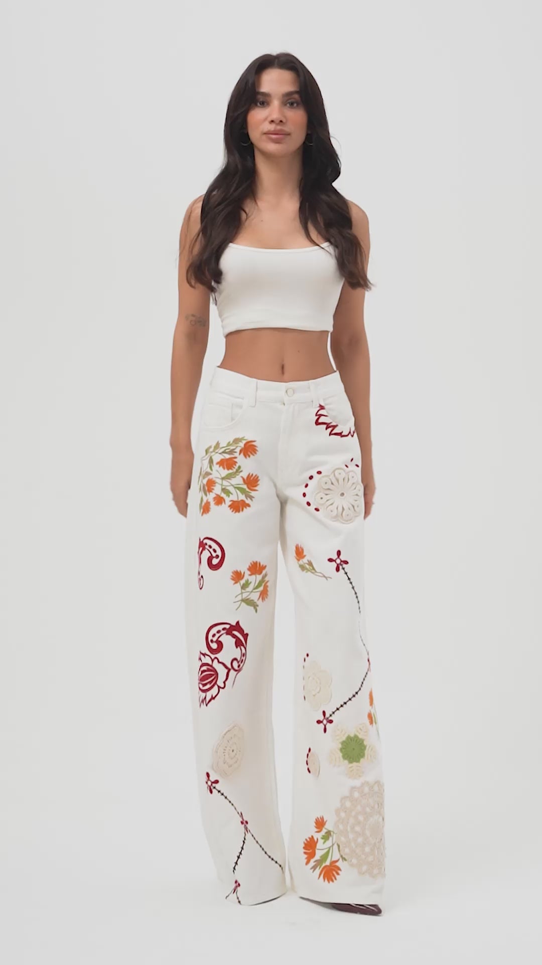 Kadın Ekru 7s6-101 Palazzo Fit Özel Desen Çiçek Nakışlı Tasarım Denim Jean