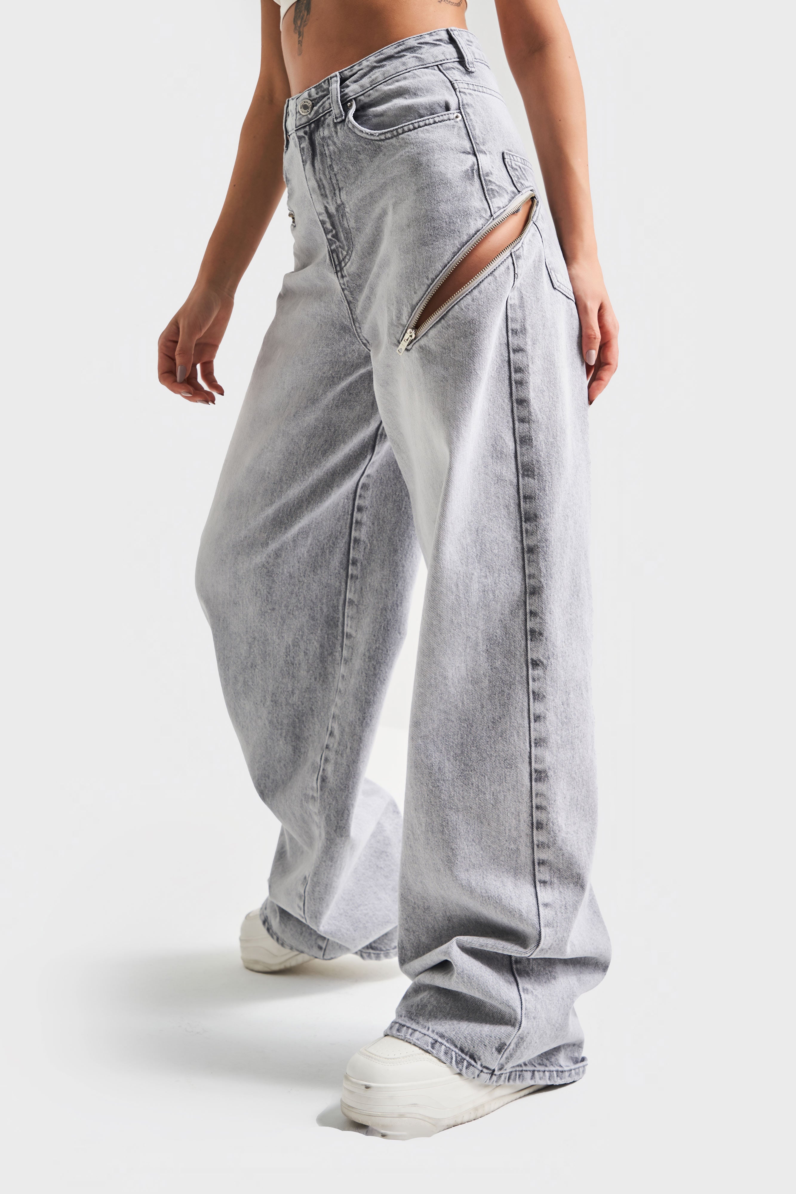 Kadın Füme Renk 2w5-62 Loose Fit Yan Süet Detaylı Özel Tasarım Denim Jean
