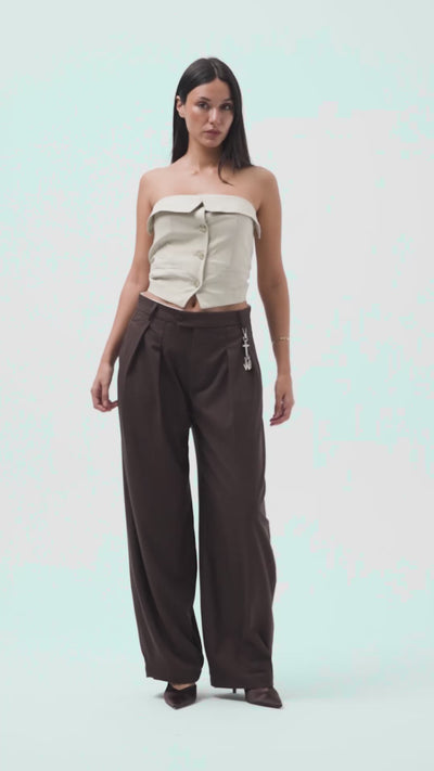 Kadın Kahverengi Aksesuar Detaylı Bol Kesim Dokuma Kumaş Özel Tasarım Pantolon
